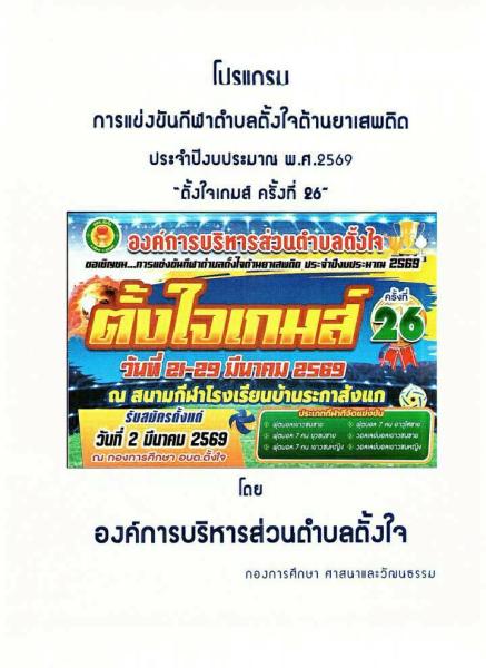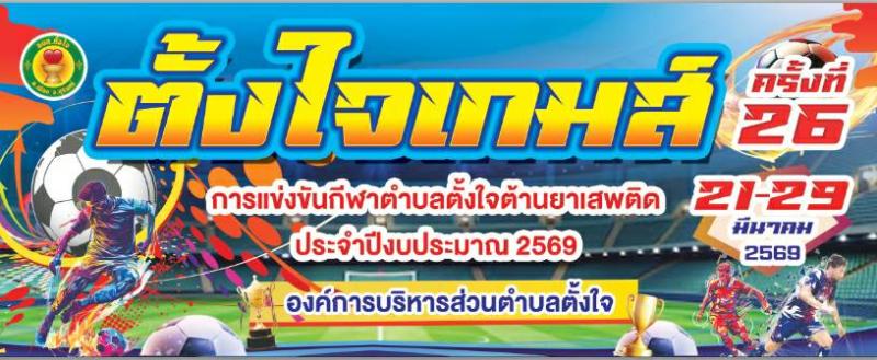 องค์การบริหารส่วนตำบลตั้งใจ กำหนดจัดการแข่งขันกีฬาตำบลตั้งใจต้านยาเสพติด "ตั้งใจเกมส์ ครั้งที่ 26" ประจำปีงบประมาณ พ.ศ.2569 ระหว่างวันที่ 21-29 เดือน มีนาคม 2569 เพื่อส่งเสริมให้ เด็ก เยาวชน และประชาชน ได้มีการออกกำลังกาย การเล่นกีฬา การเสริมสร้างทักษะทางการกีฬา การพัฒนกีฬา เพื่อความเป็นเลิศ และการพัฒนาเพื่อยกระดับการกีฬาของตำบลตั้งใจ