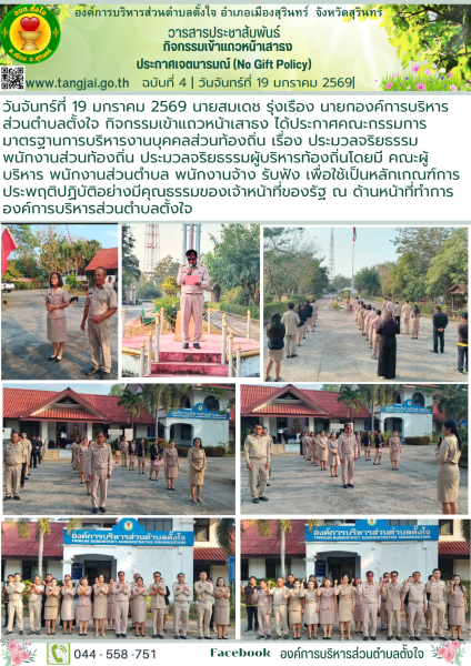 วันจันทร์ที่ 19 มกราคม 2569 นายสมเดช รุ่งเรือง นายกองค์การบริหารส่วนตำบลตั้งใจ กิจกรรมเข้าแถวหน้าเสาธง ได้ประกาศคณะกรรมการมาตรฐานการบริหารงานบุคคลส่วนท้องถิ่น เรื่อง ประมวลจริยธรรมพนักงานส่วนท้องถิ่น ประมวลจริยธรรมผู้บริหารท้องถิ่นโดยมี คณะผู้บริหาร พนักงานส่วนตำบล พนักงานจ้าง รับฟัง เพื่อใช้เป็นหลักเกณฑ์การประพฤติปฏิบัติอย่างมีคุณธรรมของเจ้าหน้าที่ของรัฐ ณ ด้านหน้าที่ทำการองค์การบริหารส่วนตำบลตั้งใจ