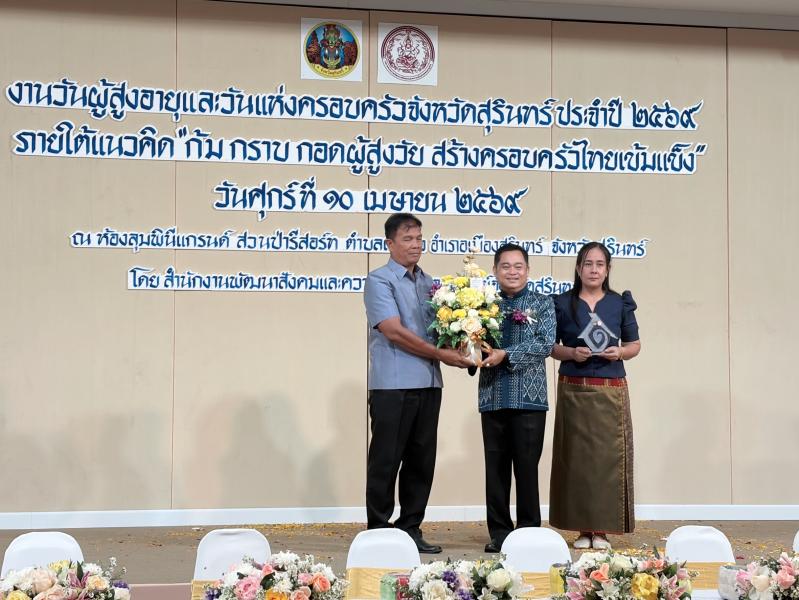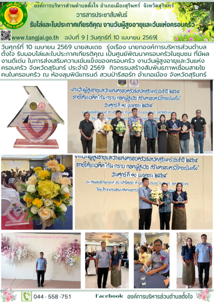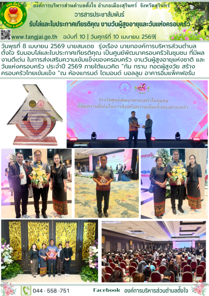 วันศุกร์ที่ 10 เมษายน 2569 นายสมเดช รุ่งเรือง นายกองค์การบริหารส่วนตำบลตั้งใจ รับมอบโล่และใบประกาศเกียรติคุณ เป็นศูนย์พัฒนาครอบครัวในชุมชน ที่มีผลงานดีเด่น ในการส่งเสริมความเข้มแข็งของครอบครัว งานวันผู้สูงอายุและวันแห่งครอบครัว จังหวัดสุรินทร์ ประจำปี 2569 กิจกรรมสร้างสัมพันธภาพเชื่อมสายใยคนในครอบครัว ณ ห้องลุมพินีแกรนด์ สวนป่ารีสอร์ท อำเภอเมือง จังหวัดสุรินทร์